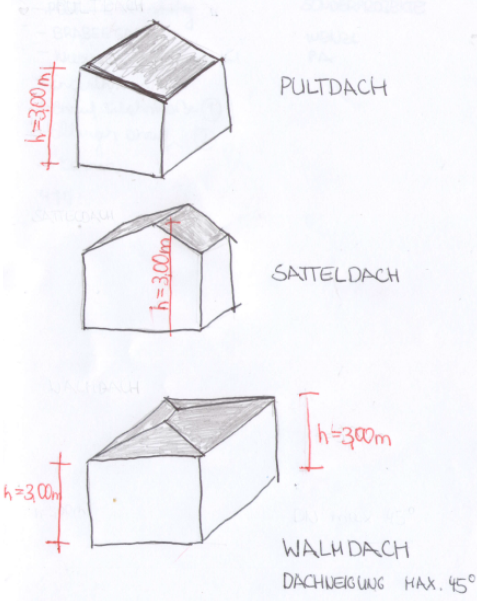 Bei Pult- und Satteldächern ist auf die maximale Gesamthöhe des Gebäudes (Firsthöhe) von 3 Metern zu achten. Bei Walmdächer gilt die Regel prinzipiell sinngemäß, aber hier bezieht sich das Ganze auf die Traufenhöhe bzw. Gebäudehöhe.